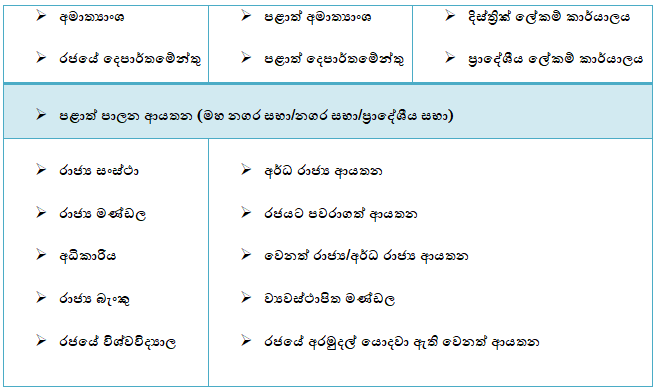 ඉහත ඡේදයෙහි සඳහන් කර ඇති නිලධාරීන් පහත සඳහන් රජයේ ආයතන ව්යුහය තුල අන්තර්ගත වේ.