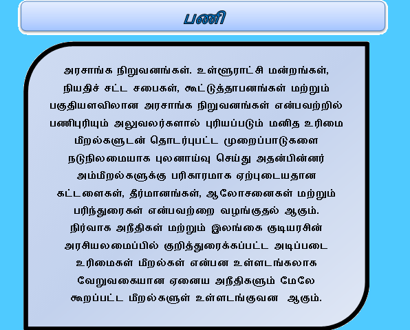 - எமது நிறுவனத்தின் பிரதான பணிகளுக்கு அமைய, எமது நாட்டின் நீதிகள் மற்றும் அதற்கு அமைய உருவாக்கப்பட்ட ஒழுங்கு விதிகள் என்பவற்றிற்கு உட்பட்டு இலங்கை அரசாங்கத்தின் நிர்வாகப்பொறிமுறையொன்றின் ஊடாக, அடிப்படை உரிமை மீறல்களால் பாதிப்படைந்த மக்களுக்கு நிவாரணம் வழங்குதல் ஆகும்.